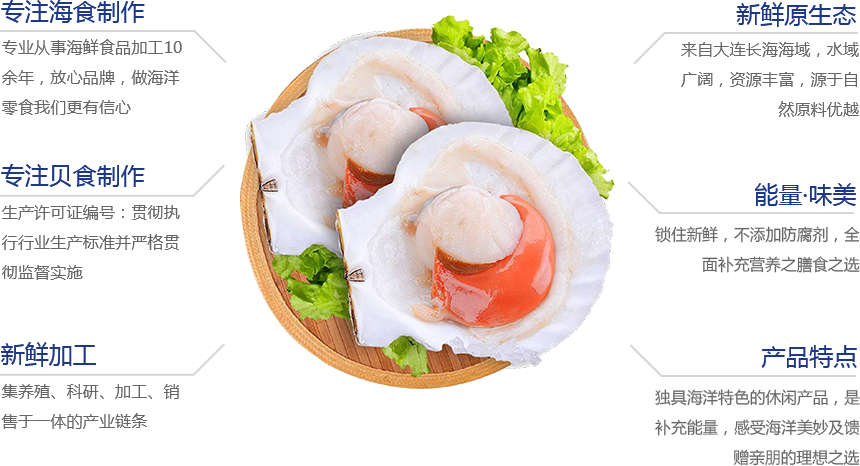 我們的海鮮零食均選至大連長海的新鮮原料,采用標準的技術設備加工而成,開袋即食,不含防腐劑,鮮嫩柔軟,鮮美多汁,真正海洋的味道。